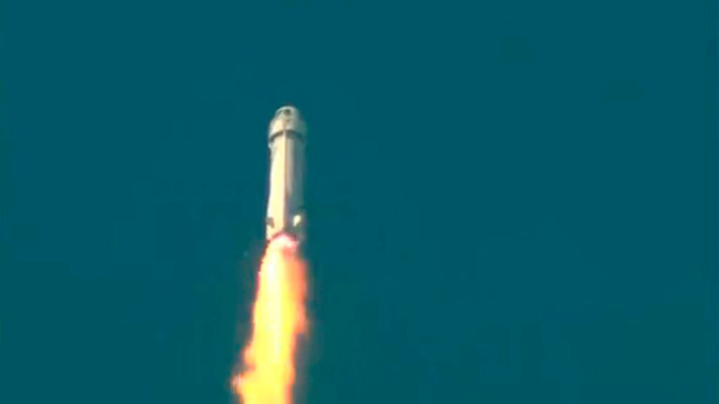 Apenas un minuto del despegue, el cohete New Shepard muestra llamas de color amarillo salientes del único motor, ubicado en la parte inferior de la aeronave. Las llamas provocan que el aparato no pueda continuar con su trayectoria y activa el sistema de lanzamiento de emergencia de la cápsula la que aterriza de manera segura en el desierto de Texas con su sistema de paracaídas.