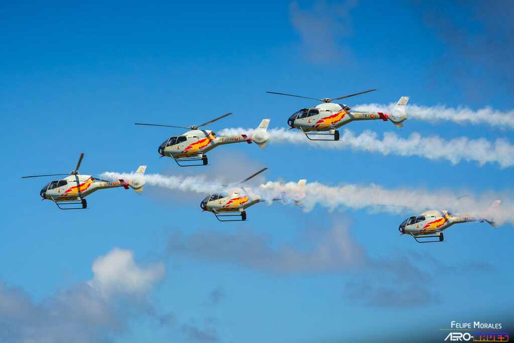 Despegaron de España el 22 de enero rumbo a la ciudad de Río de Janeiro, Brasil, para su presentación el día 28 de enero. “Asistieron cientos de personas desde una de las playas más emblemáticas del mundo. Los cinco helicópteros volaron en formación cerrada y ejecutaron una coreografía de alta precisión con pasos en formación, cruces, roturas sincronizadas y maniobras individuales. El espectáculo de 25 minutos, en el que destacaron los picados, ‘loopings’ y barrenas realizados en solitario por el helicóptero líder, concluyó con los cinco aparatos volando alineados y pintando el cielo con los colores rojo y amarillo de la bandera española”- señaló Swissinfo.ch