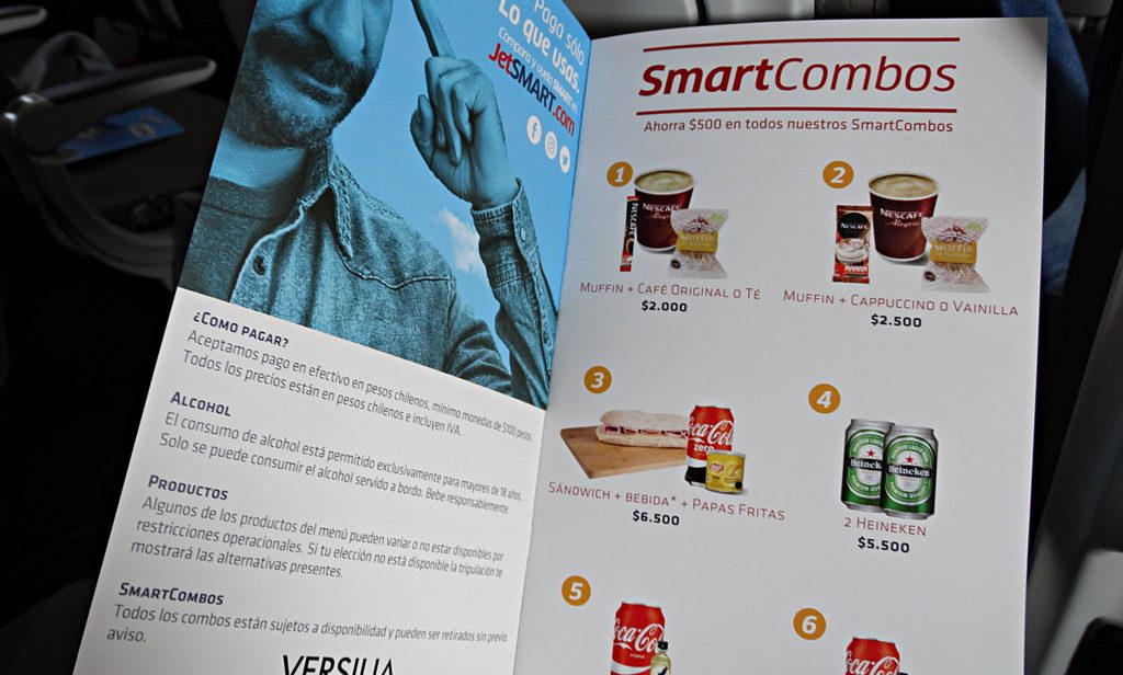 “Nuevo estándar de venta a bordo”, dicen en JetSMART. “Estamos trabajando en la implementación de un E-Menú que permitirá acceder al menú desde su smartphone, eliminando el uso de menú físico”.