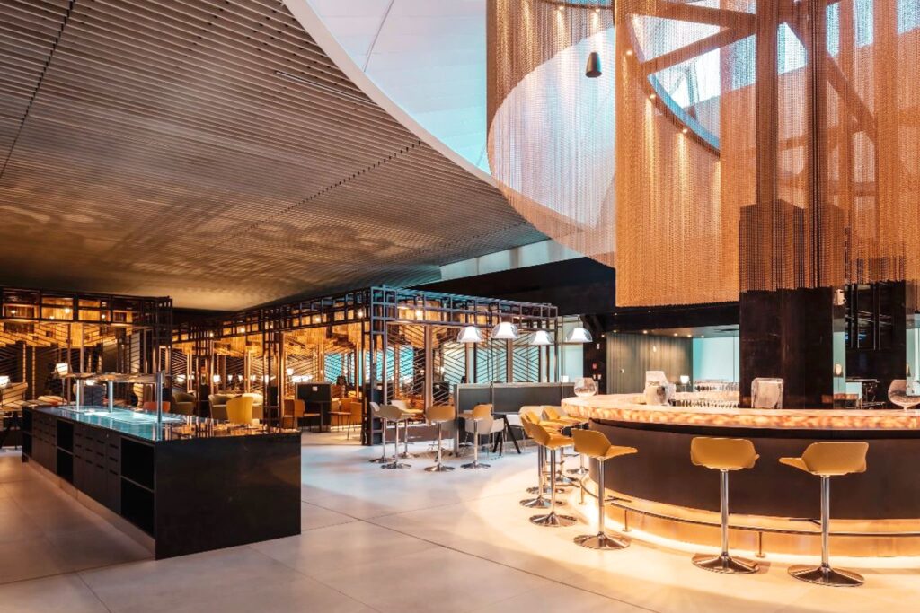 Sorprende al usuario el gran bar en el centro con la decoración de su lámpara cuya disposición recuerda -para quien haya estado- a las experiencias de otros aeropuertos de Asia o Medio Oriente. Se trata de una decoración que de cerca puede que no represente nada, pero que a lo lejos deja entrever el isotipo de la compañía.