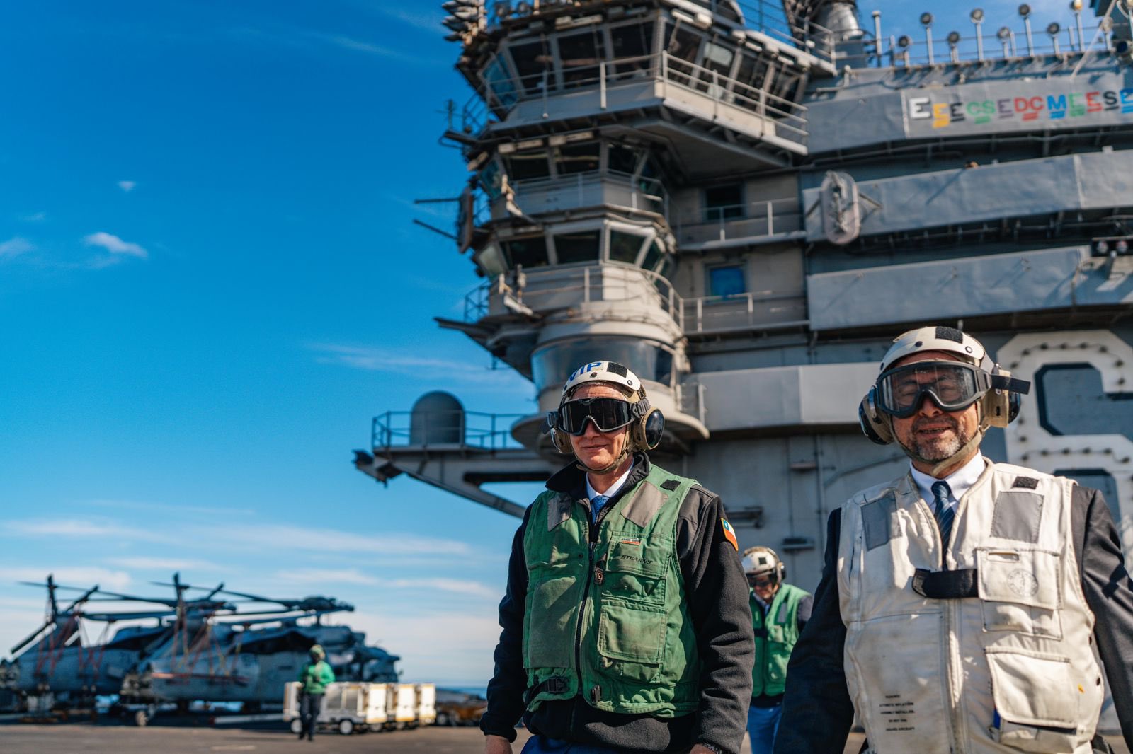 La visita comenzó en el FBO Aerocardal, donde el mandatario, abordó un avión de transporte logístico Grumman C-2 Greyhound, el cual lo trasladó directamente hasta el portaaviones USS Nimitz. A su llegada, la comitiva fue recibida por la dotación del buque y sus altos mandos, dando inicio a una jornada marcada por demostraciones operativas.